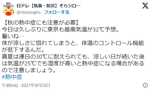 — 日テレ【気象・防災】そらジロー (@ntvsorajiro) September 23, 2021